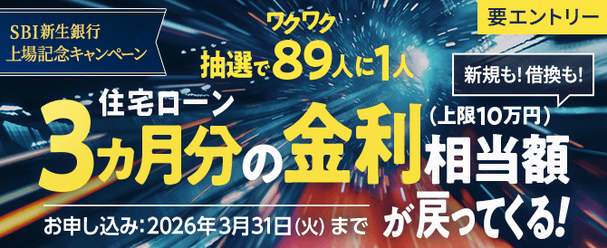 【SBI新生銀行 上場記念キャンペーン】抽選で89人に1人、住宅ローン3ヵ月分の金利相当額が戻ってくる!