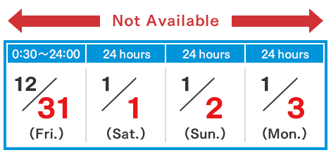 24 hours 365 days*1 ※The service will not be available during the following period; 2:00-5:00, Friday, December 31, 2021 21:00, Saturday, January 1, 2022 - 7:00, Sunday, January 2, 2022. |
