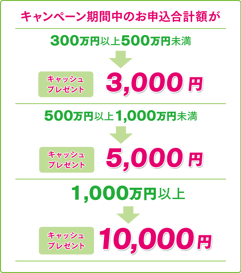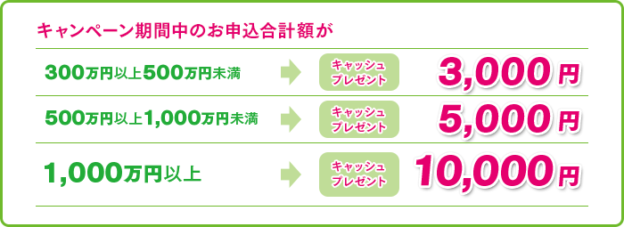 対象のお客さまがキャンペーン期間中、インターネット(新生パワーダイレクト)にてキャンペーン対象商品を合計300万円以上お申し込みいただくと、お取引金額の合計額に応じて、キャッシュプレゼント!!