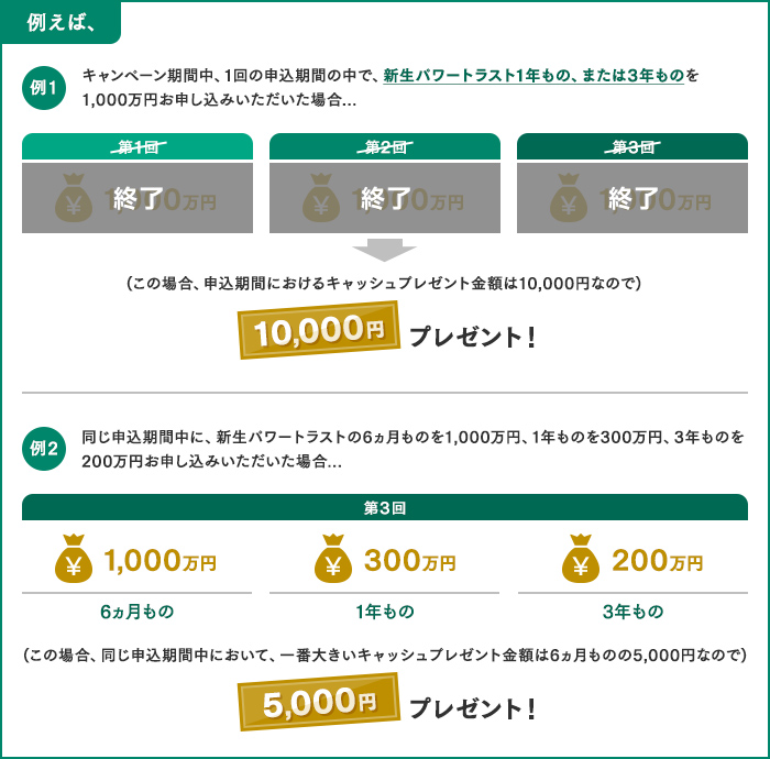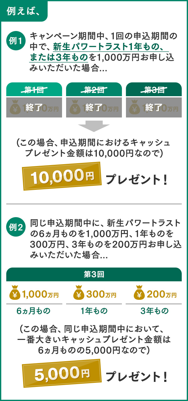 ※キャンペーン期間中、新生パワートラストは何度でもお申し込みいただけますが、各申込期間ごとにキャッシュプレゼントは1回限りとなります。同じ申込期間内に運用期間が同一の新生パワートラストを複数お申し込みいただいた場合、一番大きい申込金額のキャッシュプレゼント金額が適用となります。また、同じ申込期間内に運用期間の異なる新生パワートラストを複数お申し込みいただいた場合、一番大きいキャッシュプレゼント金額が適用されます。