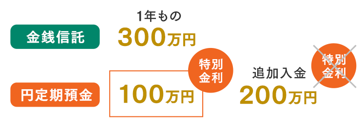 店頭または新生パワーコール(お電話)にて、新生パワートラスト(金銭信託)の各お申込期間に応じた所定の特別金利円定期預金設定期間内*4に、100万円以上の3ヵ月もの円定期預金をお預け入れいただくこと(対応する新生パワートラスト(金銭信託)のお申込期間内のお申込金額合計を上限とします)。
