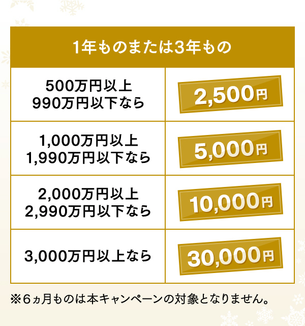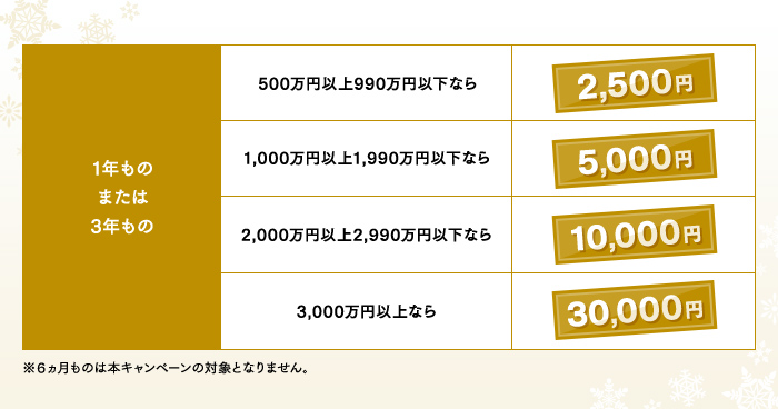 - 1回のお申し込み金額が2,000万円以上2,990万円以下の場合、10,000円キャッシュプレゼント