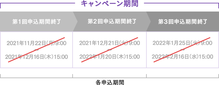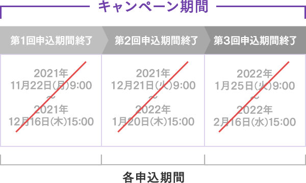 第1回:2021年11月22日(月)9:00 ~2021年12月16日(木)15:00(終了)第2回:2021年12月21日(火)9:00 ~2022年1月20日(木)15:00(終了)第3回:2022年1月25日(火)9:00 ~2022年2月16日(水)15:00(終了)