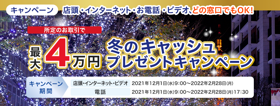 - キャンペーン期間中でも窓口の時間外の場合や、システムメンテナンスなどでお取引ができない日時があります。店舗の営業時間やお電話、ビデオでの注文受付時間などにご注意ください。