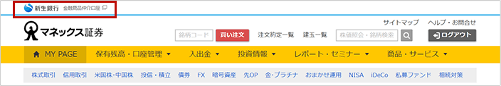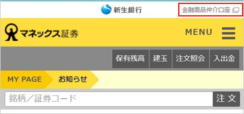 以下のように、マネックス証券サイトログイン後の画面上部に「新生銀行 金融商品仲介口座」と表示されている口座でのお取引が対象です。