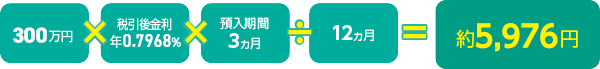 たとえば、セット定期キャンペーンの円定期預金3ヵ月ものに300万円お預け入れいただいた場合の、満期時お受け取り利息は・・・