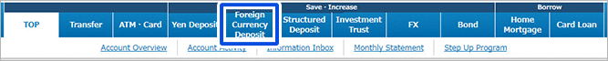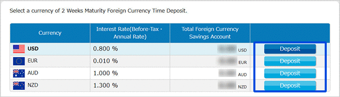 Click "2 weeks Maturity Foreign Currency Deposit"or click the "interest rate" corresponding to the currency and the term under the "Select Currency・Term".