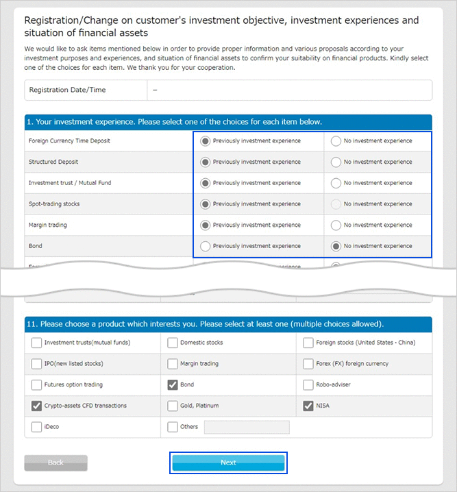 Customers who have not completed their registration for "Customer's investment objective, investment experiences and situation of financial assets" will be required to answer questions 1~11 before purchasing the financial product. Please answer the questions for customer's investment objective and investment experiences and click on "Next".
