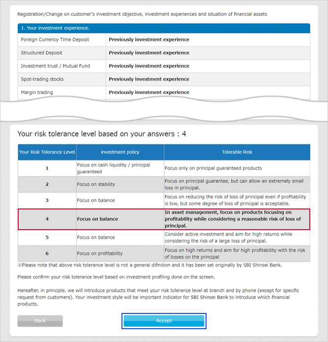 Confirm the information entered and your Risk Tolerance Level shown below and click on "Accept".