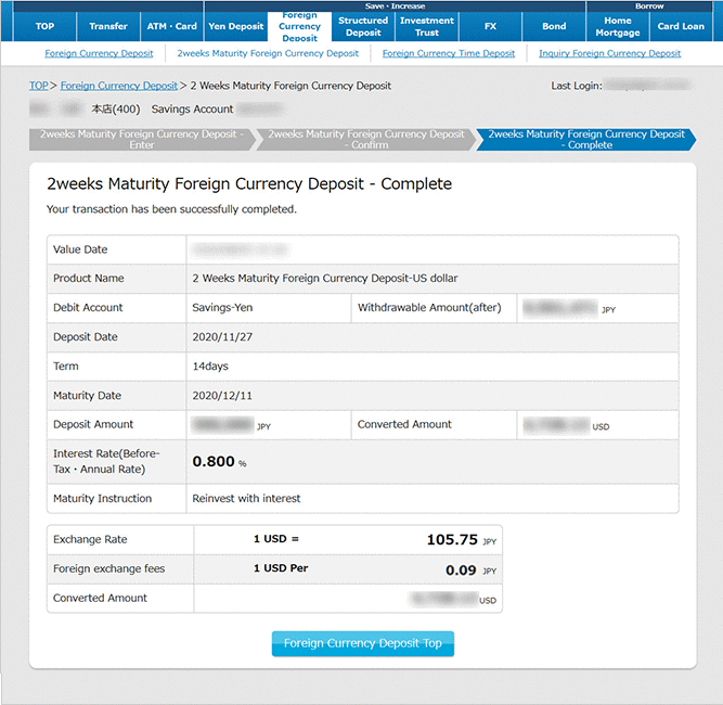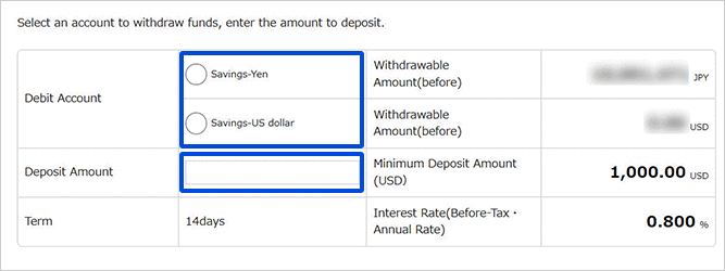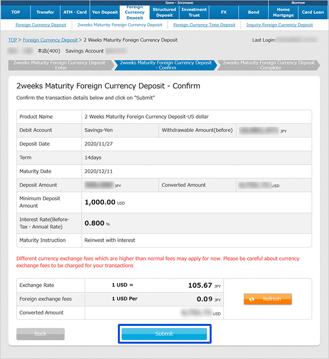 Please confirm the transaction details (interest rate, term, etc.) and make sure to confirm the applicable exchange rate when depositing from your Yen savings account before clicking on "Submit".
