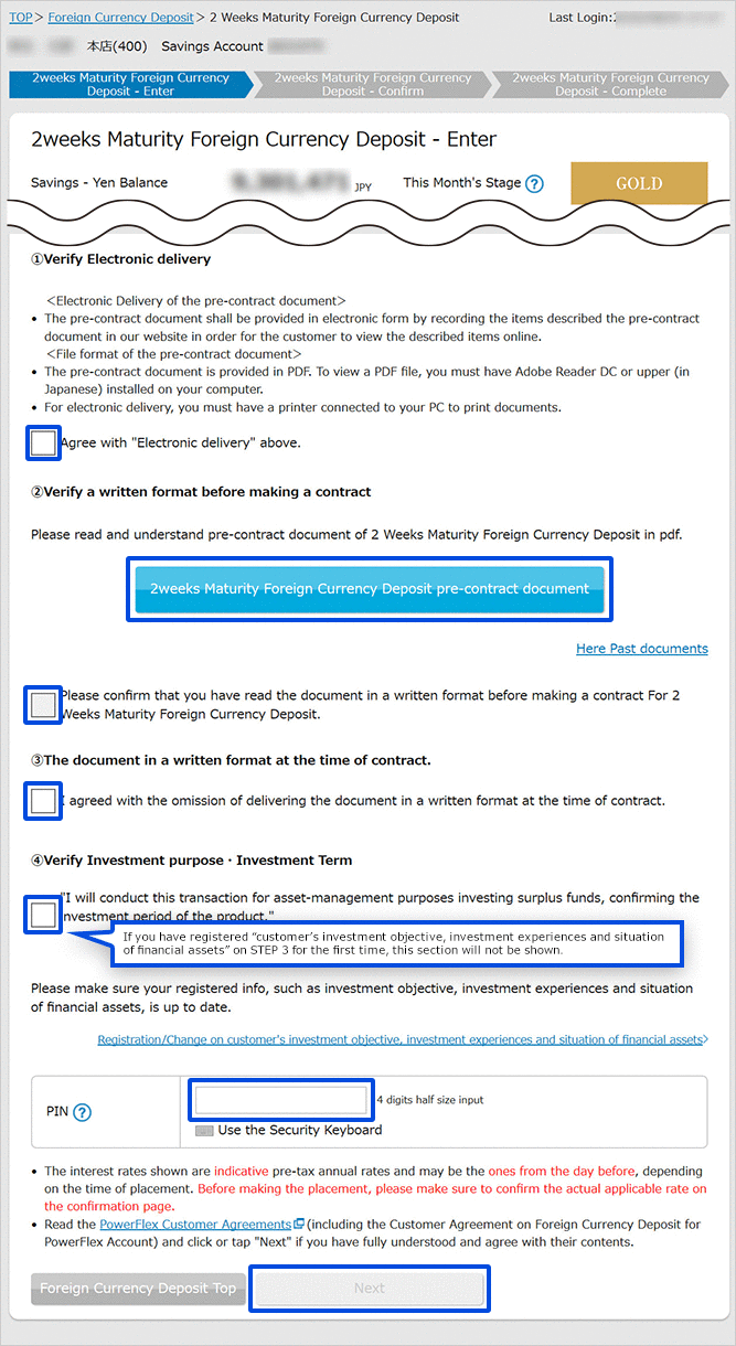Please confirm all the information shown on the page. If you agree, please tick all the check boxes. You cannot proceed without reading "2 weeks Maturity Foreign Currency Deposits pre-contract document".
