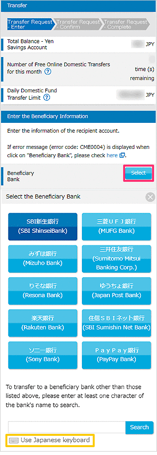 If your beneficiary bank is not on the list, please enter one or more characters of the financial institution's name and click "Search". For example, for "SBI Shinsei Bank," you could enter "S". (You can search using full-width hiragana, full-width katakana, full-width English letters, and kanji.) If you have trouble entering hiragana, please click on "Use Japanese Keyboard".