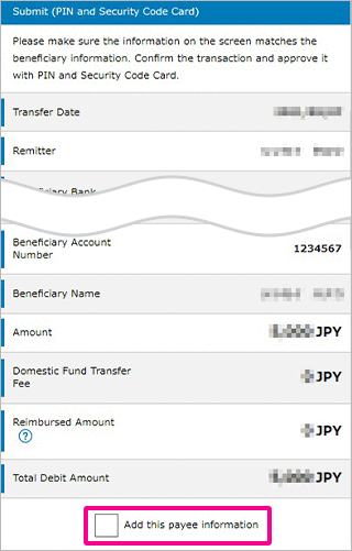 Note: If you wish to add this beneficiary account info to the "Payee info", please tick the box of"Add this payee information". You can register up to 20 beneficiary accounts.