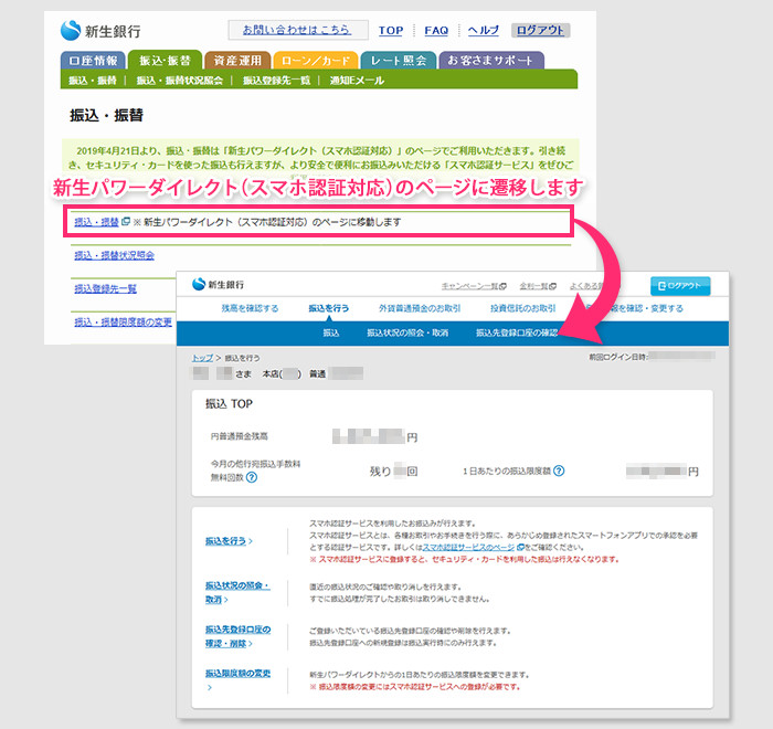- 遷移後の画面(以下参照)は新生銀行のページです。安心してご利用ください。