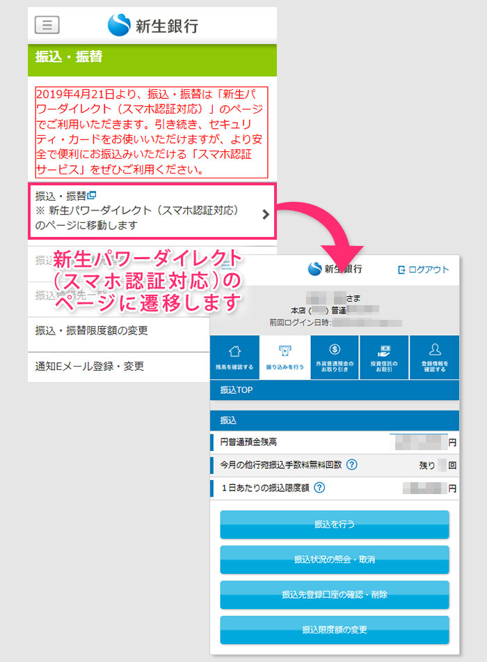 2019年7月8日(月)以降、従来の新生パワーダイレクト(青いボタンからのログイン)で「振込・振替」を選択すると、以下のように新生パワーダイレクト(スマホ認証対応)の画面に自動的に遷移します(新しいウィンドウが開きます)。
