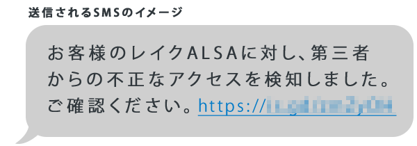 不審な電子メールやSMSに記載されているリンク先ページは、公式ホームページに似せた偽サイト(不正サイト)であり、お客さま情報を盗み取ろうとするものです。記載されたリンクへのアクセスや重要情報(口座番号、クレジットカード番号、会員番号、ログインIDやパスワード、暗証番号、氏名、住所等)の入力は絶対にしないようご注意ください。