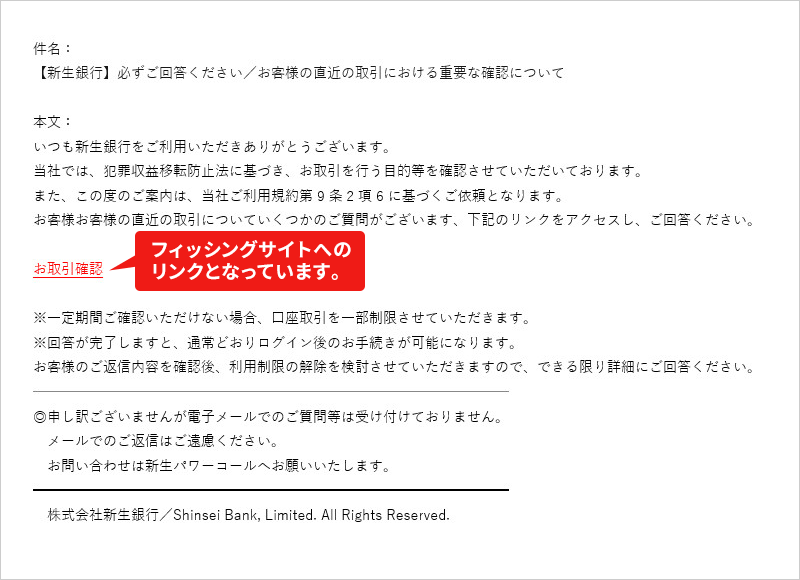 具体的な手口としては、新生銀行を装った電子メールが不特定多数の方に送信されており、電子メールに記載されたURLやリンクにアクセスすると新生銀行のホームページを模したフィッシングサイトに繋がります。
