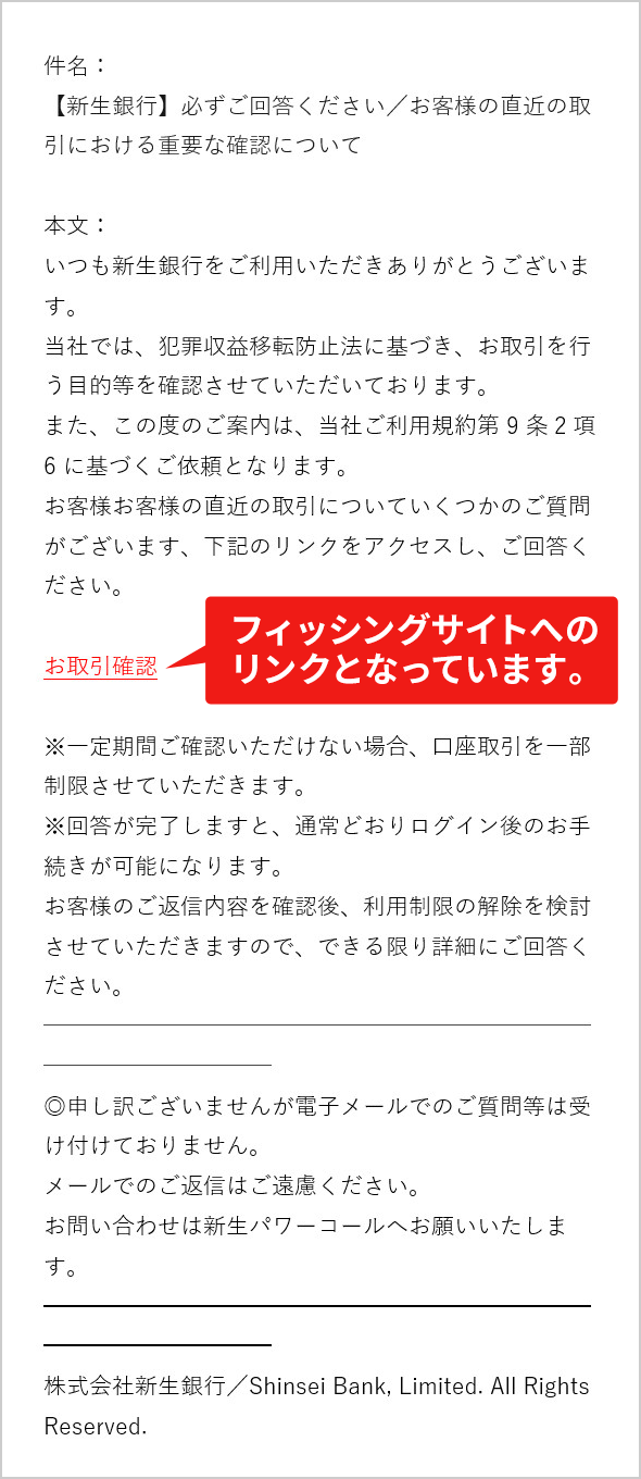 不審な電子メールやSMS等に記載されているリンク先ページは、お客さまの情報を盗み取る目的で新生銀行の公式ホームページに似せて作成された偽サイト(フィッシングサイト)です。記載されたリンクへのアクセスやお客さまの重要情報(口座番号、ログインIDやパスワード、暗証番号、セキュリティカード情報、氏名、生年月日、電話番号、住所等)の入力は絶対にしないようご注意ください。