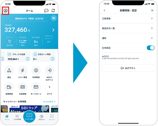 ▼ホーム画面左上のアイコンからアプリの設定やログアウトが簡単にできるようになりました。