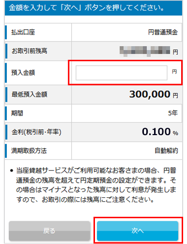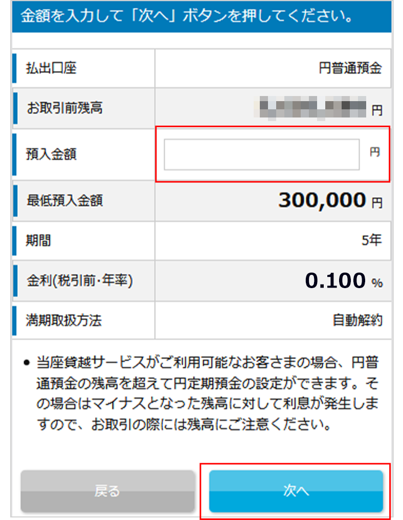 ご希望のお預入条件を選択後、預入金額を入力して「次へ」ボタンをタップしてください。