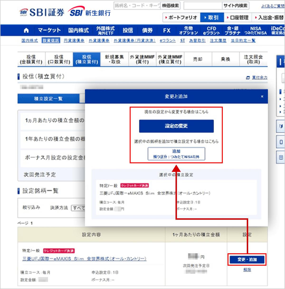 ログイン後のSBI証券WEBサイト「取引」>「投資信託」>「投信(積立買付)」から投信積立の設定状況をご確認いただけます。また、設定済の投信積立の変更には3つの種類があります。