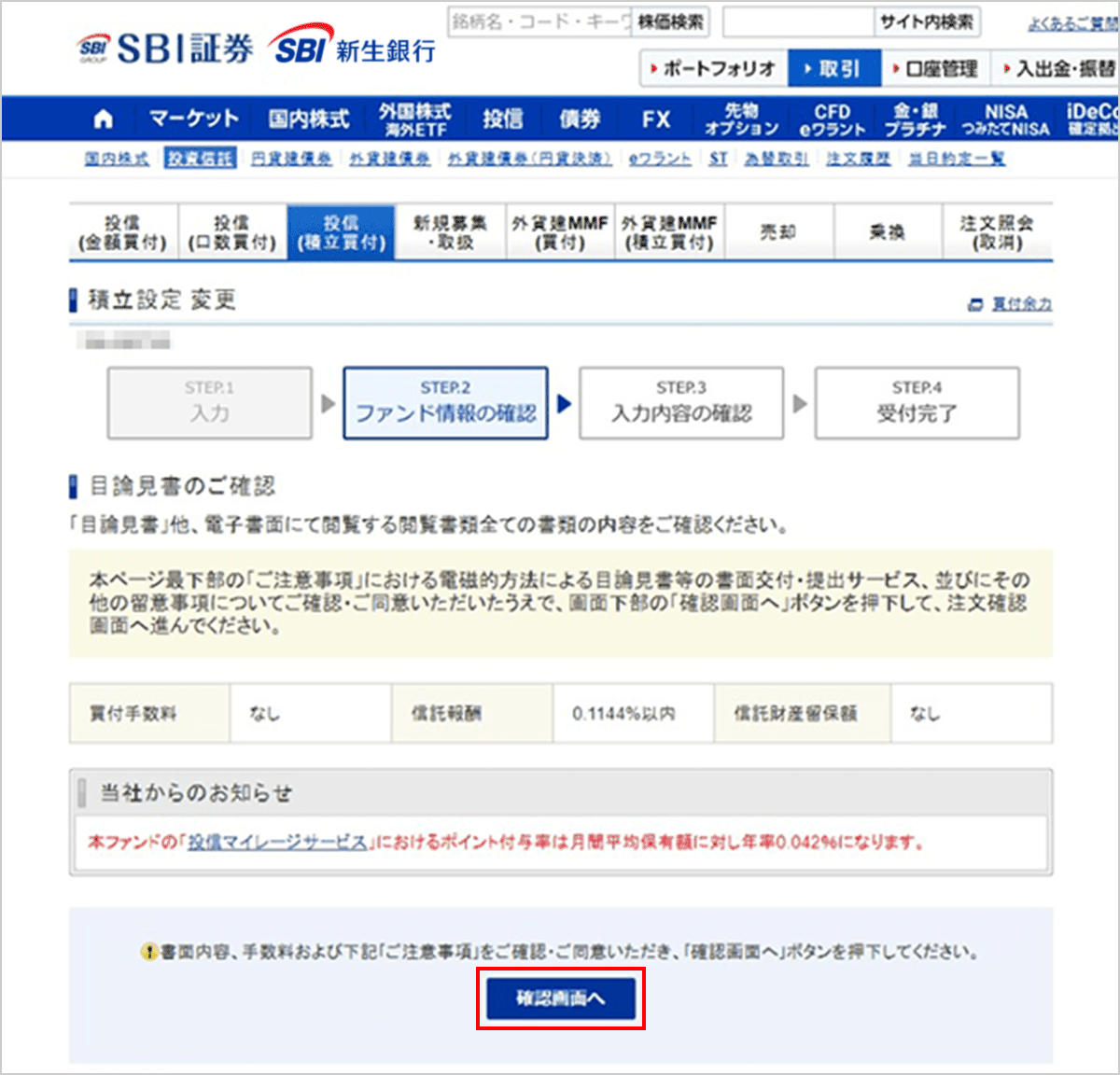 - 前回の積立設定以降に、目論見書の変更があった場合は、再度「目論見書」・「補完書面等」のご確認が必要となります。