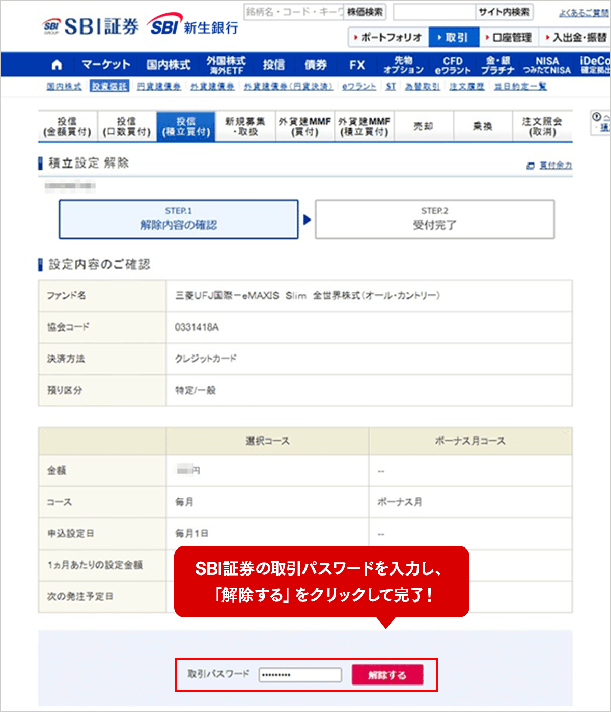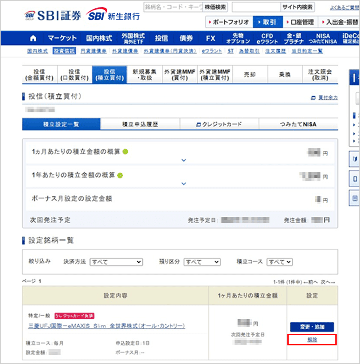 ログイン後のSBI証券WEBサイト「取引」>「投資信託」>「投信(積立買付)」画面の積立設定一覧にて、設定を解除したいファンドの「解除」へおすすみください。