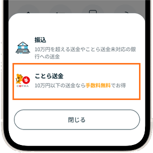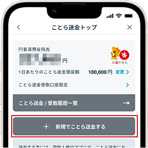 • ことら送金は1回あたり10万円以下(1日あたりの送金上限額は10万円)の金額で送金可能です。