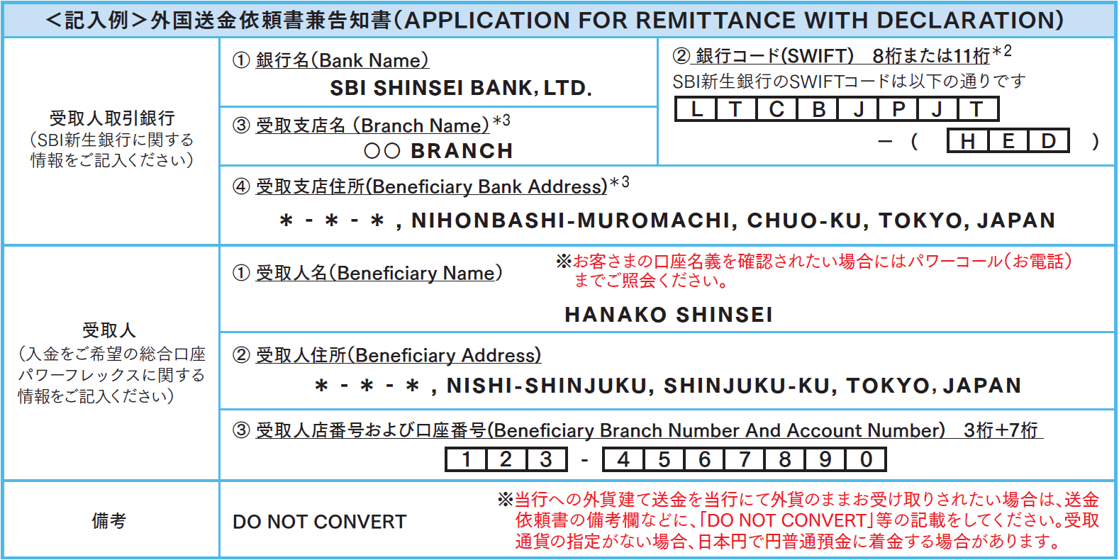 *2 ABA(Fed Wire)Number/Routing Number、その他SWIFT以外の銀行コードは保有しておりません。SWIFTコードで受け取りが可能です。