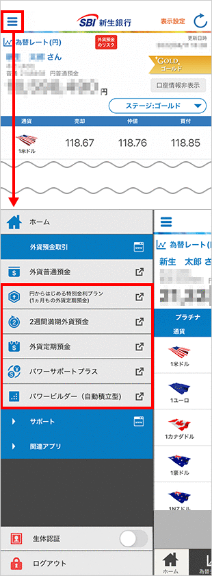 画面上部のメニューボタンをタップし、サイドメニューを表示させます。「外貨預金取引」にあるご希望の外貨定期預金をタップしてください。