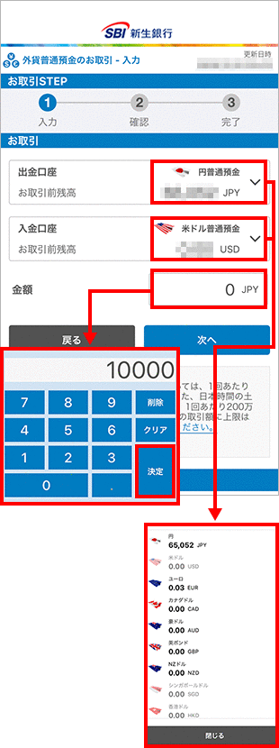 「金額」の金額欄をタップし、お取引金額を出金口座の通貨単位で入力し、「決定」をタップしてください。