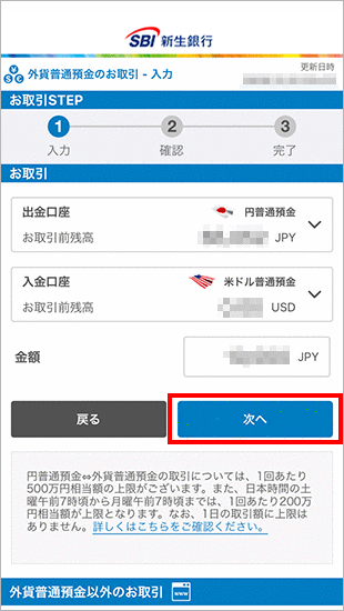 - 外貨の取引にあたっては1回あたりのお取引金額の上限がございます(1日の取引に上限はありません)。詳しくは【1回あたり】外貨普通預金のお振替・円から外貨定期預金設定額の上限についてをご覧ください。