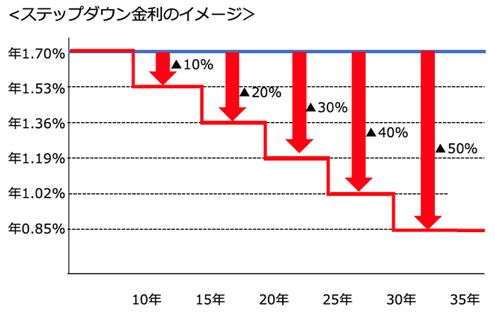 ステップダウン金利タイプは、固定金利タイプではありますが、一定期間が経過すると徐々に金利が下がっていく仕組みになっています。下記は、35年ローンで10年後から10%ずつ金利が引き下がるタイプのステップダウン金利のイメージ図です。SBI新生銀行では、上記の当初固定金利タイプの他に、ステップダウン金利タイプも提供しています。