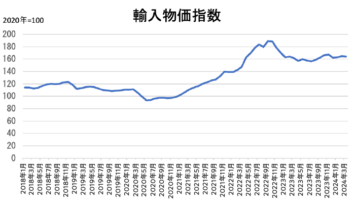 (出典)日本銀行 時系列統計データ検索サイトの企業物価指数のうち輸入物価指数のデータを使用し筆者作成