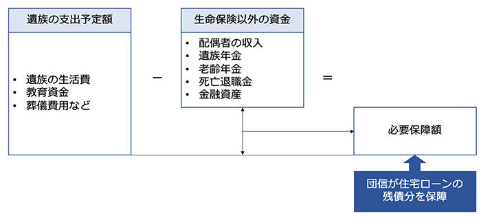 住宅ローンを返済中の方は後述する団体信用生命保険(以下、団信)に加入している方が多いと思います。その場合は、団信の保障分を差し引いて不足する分の必要保障額を計算します。