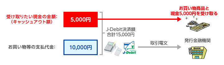 商品代金に、受け取りたい現金の金額を上乗せした合計金額でJ-Debitの決済をして、商品と現金を受け取ります。