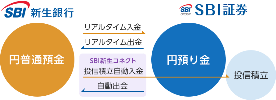 SBI新生銀行円普通預金残高から、SBI証券における投信積立の設定金額を自動入金するサービスです。また、その日使わなかった資金は、自動でSBI証券の円預り金からSBI新生銀行の円普通預金口座へ出金いたします。