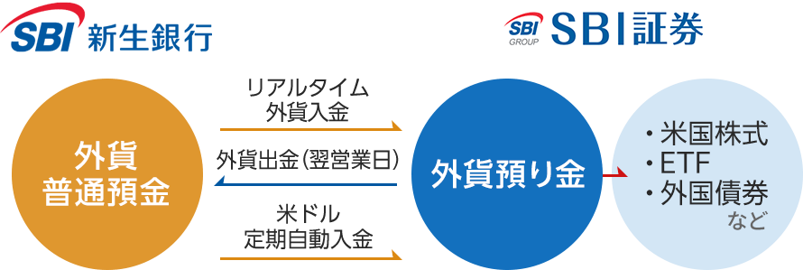 SBI新生銀行の所定の外貨普通預金口座にある外貨を手数料無料で、リアルタイムにSBI証券の外貨建口座へ入金できるサービスです。