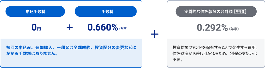 日次報酬額の計算方法については、日々の運用資産額(現金部分除く取得有価証券の時価評価額)に0.660%(年率・税込)を乗じた額を365で除すことによって算出します。毎月の手数料は、毎月1日から月末日までの日次報酬額を合計した金額となります(1円未満切捨て)。(*1、*2) [計算式] 日次報酬額=日々の運用資産額×0.660%÷365 月次報酬額=A+B(1円未満切捨て) A[確定値]=日次報酬額(1日目)+日次報酬額(2日目)・・・+日次報酬額(月末最終営業日の前営業日) B[概算値]=日次報酬額(月末最終営業日の前営業日の翌日)・・・+日次報酬額(月末日) |