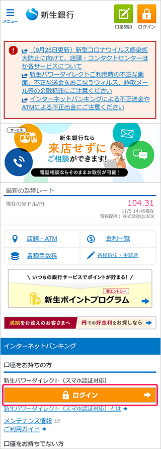 SBI新生銀行ホームページからパワーダイレクト(スマホ認証対応)にログイン後、振込メニューまでお進みください。