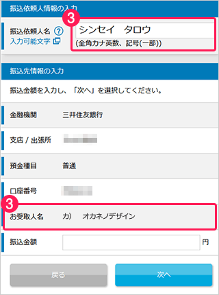 次の画面で、振込依頼人名がお客さまの氏名(カナ)になっていること、受取人名が「カ)オカネノデザイン」であることを確認し、振込を実行してください。