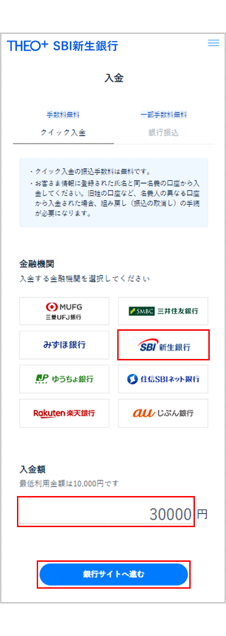 表示される金融機関からSBI新生銀行を選択し、金額を入力した後、銀行サイトへ進むを選択してください。