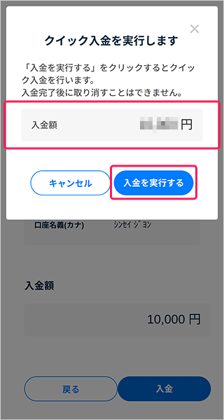 入金額を確認のうえ、「入金を実行する」を選択してください。