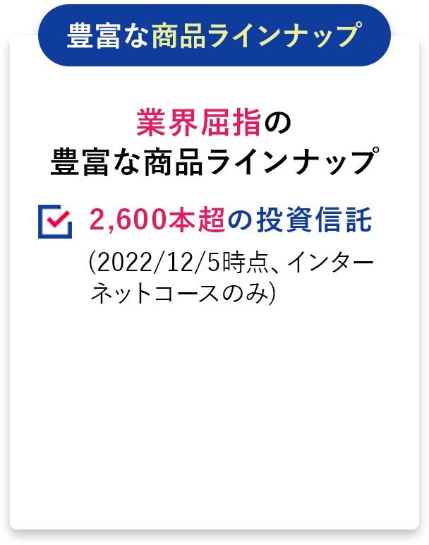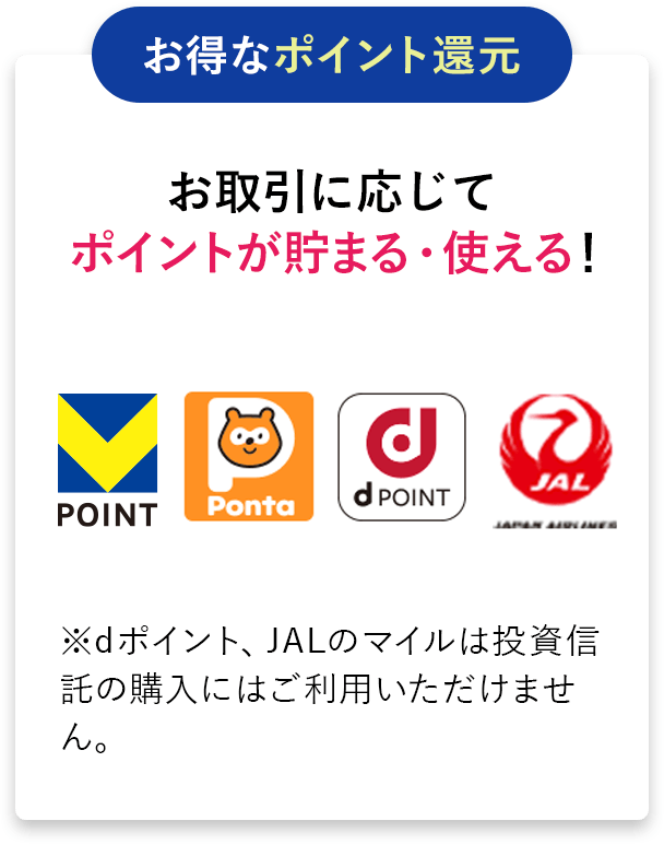 - 当行はSBI証券またはマネックス証券の委託を受け金融商品仲介を行うものであり、当行が取り扱う投資信託についていただいたお客さまのお申込みは、お客さまが選択された委託金融商品取引業者に取り次ぎを行います。お取引にあたってはSBI証券またはマネックス証券の証券総合口座の開設が必要になり、口座開設後の投資信託にかかるお取引については、お客さまと委託金融商品取引業者とのお取引になります。なおSBI証券またはマネックス証券の商品であっても、当行が取扱いしていないファンドがあります。