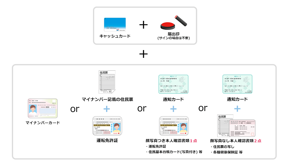 (マイナンバーカードなら1点、最新の住所氏名が記載されている通知カードの場合は併せて運転免許証等をお持ちください。)