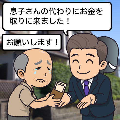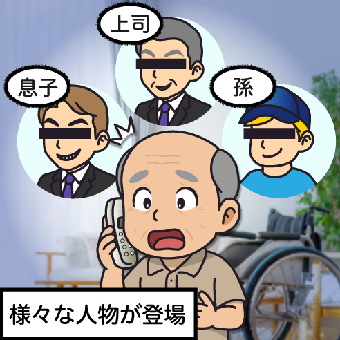 息子や孫、上司などを装い、複数名が交代で電話口に出てきます。代理の者に行かせるからお金を渡してほしいと言われます。
