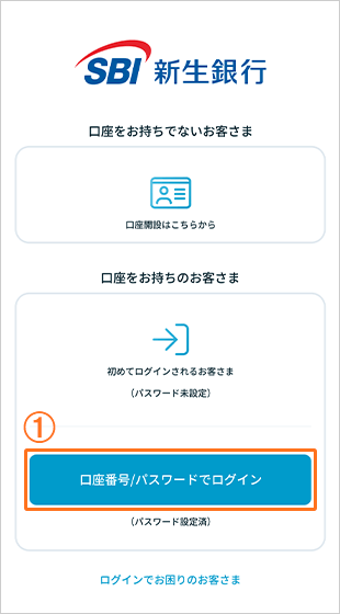 アプリダウンロード後にアプリを起動し、「口座番号/パスワードでログイン」をタップします。