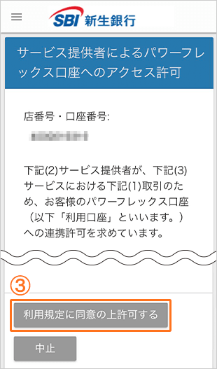 総合口座パワーフレックスへのアクセス許可の「利用規定に同意の上許可する」をタップします。