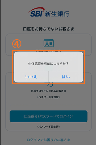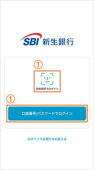 生体認証を有効にしていない場合や、認証の有効期限が切れた場合(60日以内にアプリを再び起動しない、アプリをアップデートした場合等)は、 「口座番号/パスワードでログイン」をタップします。