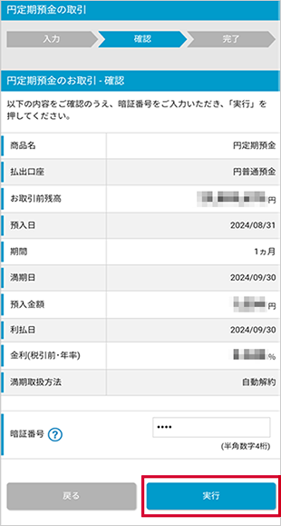 内容をご確認いただき、4桁の暗証番号をご入力のうえ、「実行」ボタンをタップします。